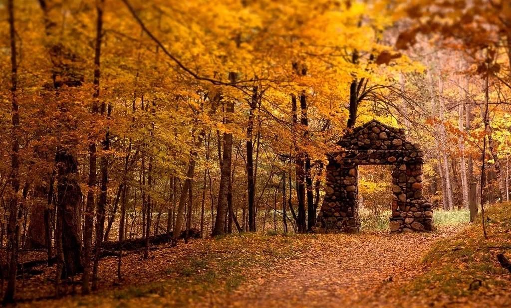 我们即将前往的栗子山,明亮金黄的落叶散落群山,朦朦胧胧的山雾随风飘荡。