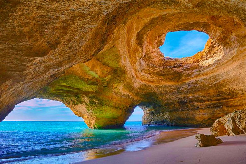 【葡萄牙】沧海遗珠探险之旅湛蓝海水、黄石巨岩、照进洞中的明媚阳光、烁白狭长的海滩,这里就是位于南葡阿尔加维海滩的贝纳吉尔岩洞。