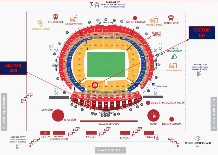 球场内部装修也会给人留下深刻的印象,每一个细节每一个角落都以红白为主题,让大家进入球场后就能完完全全地感受到马竞的气息和氛围。除了外观,您还可以欣赏到一面代表马竞球迷无限荣誉的旗帜。338平方米的巨大旗帜随风飘扬,这也是目前西班牙最大的旗帜。在球场的主看台(西看台)前面,您还将参观到马德里竞技俱乐部的“传奇之路”,这是个充满荣誉的地方,所有代表马竞效力超过100场正式比赛的球员,都将自己的纪念牌留在这里,参观路线从10号门开始。